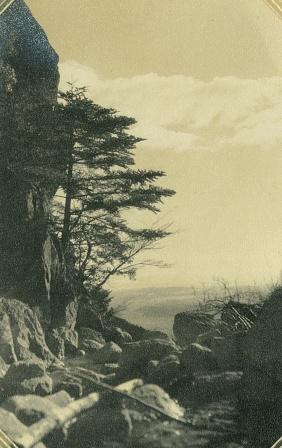 私たち三人は五峰の頂上から左に派生した支稜に取りついた。はい松を交えた痩せ尾根をくばらく下ると、突如として前方に視界が開け、すごく切れ落ちている。はじめてザイルを取り出して、素早く各自胴体を結びつけると、トップの二年生が「じゃ行くぞ。」と力強く呼びかけた。ザイルの真ん中にいる私は、すぐしっかりした足場を踏まえて、ザイルを肩にまわし確保の姿勢をとった。郷里の山で十分練習した姿勢だ。「よし。」トップは右側の断崖に沿って徐々に降り初め、まもなく足も手も、岩陰に消えた。ザイルのわずかな振動だけが、トップの状態を伝えてくる。相当な難場らしく、ザイルはじりじり律動するだけで伸びてゆこうとしない。私は万一の滑落に備えて腕に力を込め、呼吸を静めた。ようやくザイルが動き始めたと思うと、気持ちよくするすると伸びていった。「あと5メ-トル。」返事か聞こえ、それでも3mばかりさらに伸びていった。