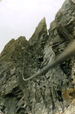 谷底からうつろな声が響いてくる。私は足元のあやしい断崖の上に立つと、あれほど自信のあった懸垂であったのに、ザイルのかけ方まで忘れてしまって、ああでもないこうでもないと困ってふらふらしてしまった。下を見ると、頭がカ-ッとなって岩壁はどこまで続いているのか見当もつかないし、リーダーの姿も見えない。それでも意を決しており始めると、ようやくいつもの快適な懸垂の気分になった。降り終わってリーダーと並んで立つ。下から眺めると、今降りてきた壁は手がかりも足場も皆目わからないが、先輩Tの血の出るような苦闘によって完登されたものだと、リーダーが仰ぎながらいう。ちょっと信じられないくらいである。