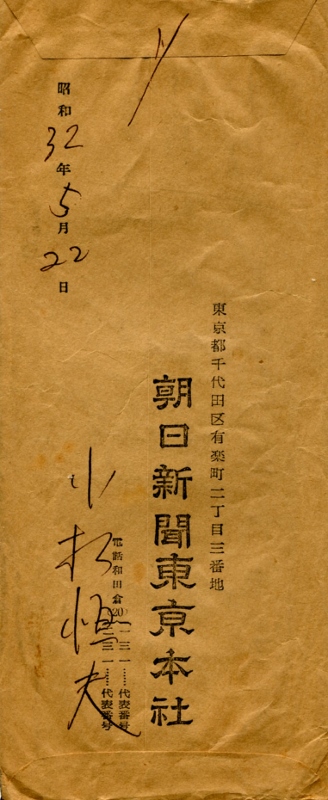 貴社発行『週刊朝日』6月2日号を拝読させていただきました。この記載事項中,「ナイロン・ザイル事件」という小見出しで岩稜会の若山氏の遭難模様を読ませていただいたわけなんですが,登山等全然やったことのない私等,登山するについていかなるルートがあるかなど全然わかろう筈がありませんが,ただ,ザイルがナイロン製であったということに対して常々不安を感じていただけに,とくに何かこの記事に力を入れて読んだわけですが,常々私たちが不安と言っていることとは一体何であるかは別紙に記載いたしました通りであります。