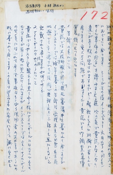 1.どういうル-トで来たのか知りませんが、大阪日日新聞の記者がナイロンザイル事件に関する記事を見せてくれといって来ました。これを頼まれたのは私の研究室にいる藤井という人で、この人は国分寺で先々月来問題になっております公園住宅の家賃の問題で割合中心になっていた人で、国会にも証人として出席しました。大阪日日新聞はこの記事を大々的に取り上げておりましたので、おそらくどこかで日日の記者が私のことをかぎつけて、藤井に頼んで来たのではないかと思います。いただいたプリントはもちろん他の新聞記者も見ていることでもあり、明日渡してやろうと思いますが、この前にもお話ししました如く、仮に新聞に出る場合には、加藤氏が大阪へ来られた直後くらいにすれば効果的と思い、勝手にこちらで小生が事を計るというようなことはいたしませんが、こういう事情もあるということをお含みくだされば幸甚に存じます。