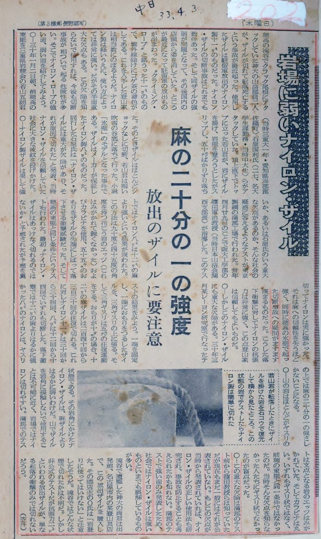 4月3日 中日新聞記事「岩場に弱いナイロン・ザイル 麻の20分の1の強度 放出のザイルに要注意」