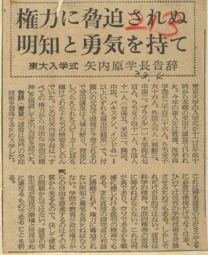 4月12日 新聞名不明の記事「権力に脅迫されぬ明知と勇気を持て」東大入学式矢内原学長告辞