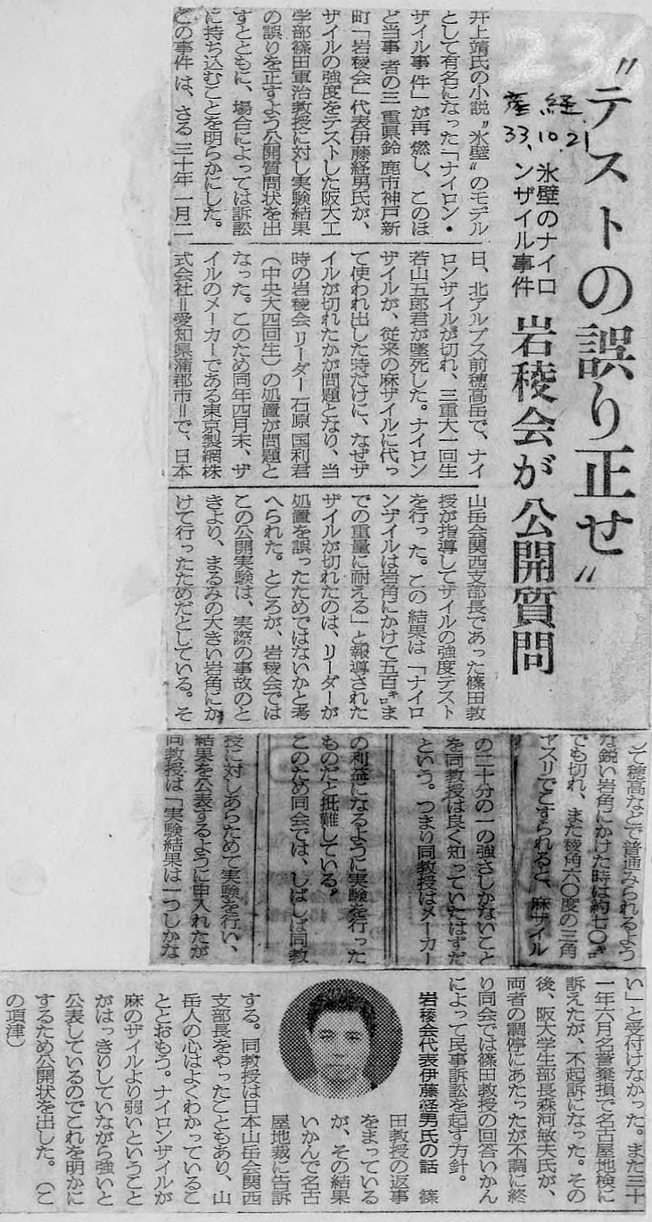 私の実験は,飛行機や船舶に使うロープの実験の一つとして行ったもので,岩稜会の事故の原因を調べるために行ったものでないから,岩稜会の人々の非難は当たらない。また,私の実験は,ナイロンザイルの強い点と弱い点とを調べるため,3年半もかかってこの6月ようやく完成したもので,岩稜会の人々はこの長い実験のごく一部を聞いて勘違いしたものと思う。ナイロンザイルはすでに岩角に弱いことは明らかであるが,その他の場合には強く,結局,麻もナイロンも長所と短所を持っており,長所をよく知って使えば,ナイロンザイルは登山には非常に適している。(CK.夏目放送記者 提供)