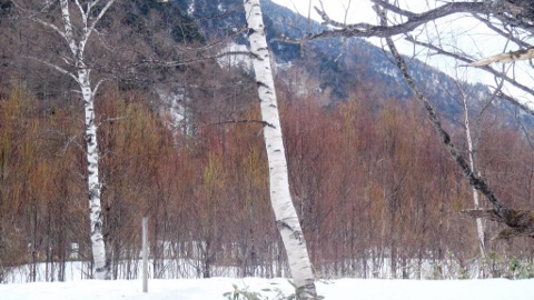 | 上高地公園活動ステーションに向かう道 ![]() 化粧柳の新芽が七色に輝いて |