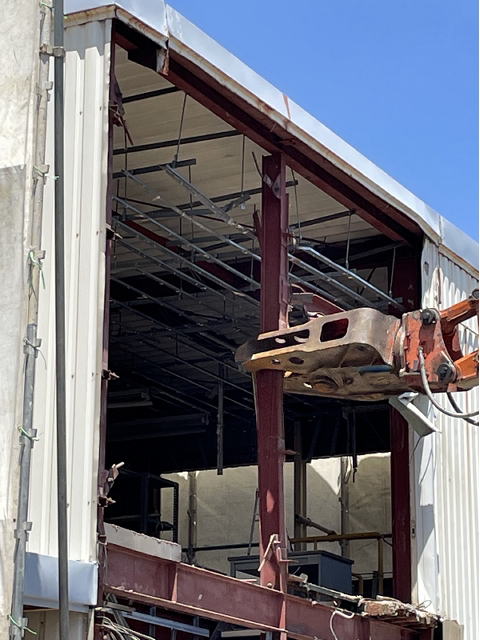 油圧ショベルのエンジン音が響いて作業開始です ![]() 研究所のシンボルとなった山型の三本柱に襲い掛かるショベルカ-は まるでTレックス(ティラノサウルス)のようです |